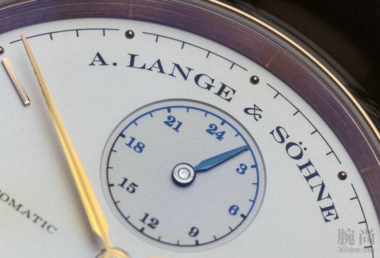 很多人都喜欢朗格采用的蓝钢实心表针的设计。金针和蓝钢针对比也非常明显,易于辨识。表盘的表面处理也是完美的,两个小表盘和主表盘之间的小反差让人很喜欢。 你会注意到,为了保持平衡,表盘中间左右文字是AUTOMATIC 和 DUAL TIME,不知你注意到了吗?包括空格在内,两边字母数字相同,这就能保持表盘平衡之美!