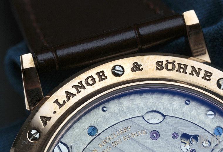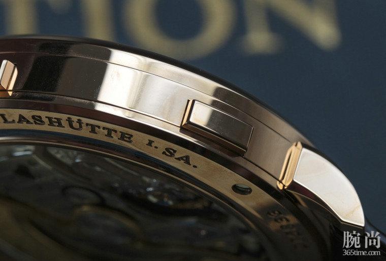 朗格Saxonia系列 Dual Time两地时腕表的表壳左侧就是时区按钮,按动侧面8点钟和10点钟的两枚按钮,便可轻易设置腕表的第二时区。上方按钮推动金质时针向前运行一小时,而下方按钮则可逆向转动时针。