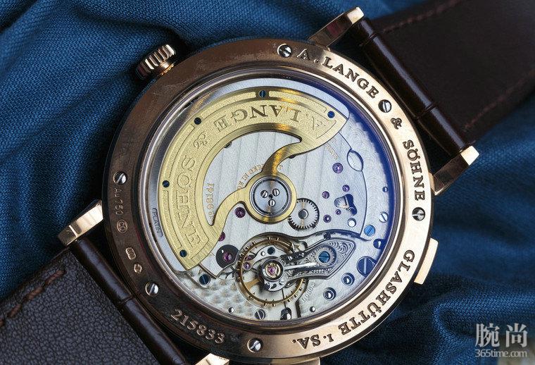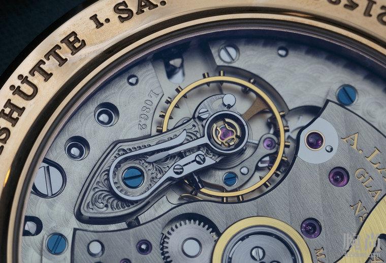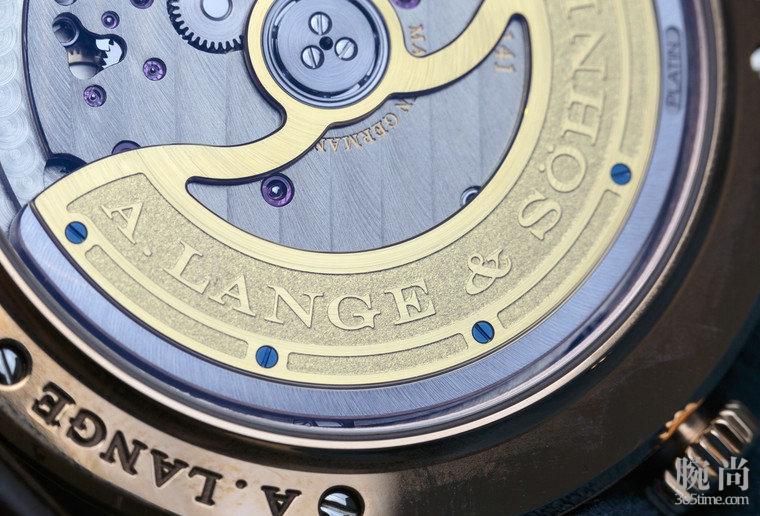 朗格真正的魅力在于它的背面那美丽的机芯,我们把这款朗格Saxonia系列 Dual Time两地时腕表翻转过来,能发现采用的是L086.2自动机芯。 虽然不是不是3/4转陀的Sax-O-Mat机芯。没有偏心转陀美观,但由于使用中央转陀,发条就能选择较大的,结合摩擦损失的减少,可以改善手表的动力储备的能力。 此动力储备达三天之久,很实用。 k金转陀外圈是更重的铂金材质,这样可以在较小的厚度内保证足够的上链效率。传统的装饰与抛光技术均体现萨克森工艺的悠久传统和经验。3/4夹板和鹅颈式杠杆的边缘,以及蓝色螺丝槽均经人手倒角和抛光。这个价位上,绝对是块赏心悦目的好机芯。