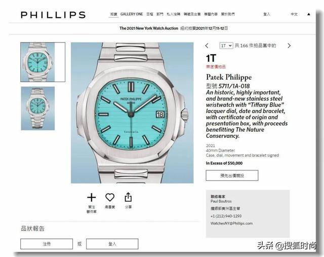 这款腕表限量发售170枚,公价为52635美元(约合33.5万元人民币),而根据两个品牌的计划,在美国的蒂芙尼精选门店销售该限量合作款之前,全球首枚亮相的合作款腕表,将在纽约由富艺斯(Phillips)拍卖行拍出,所得款项将全部捐赠给“大自然保护协会(The Nature Conservancy)”。