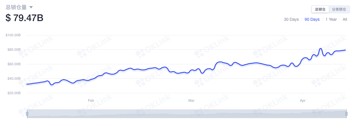 热门的DeFi在谷歌的搜索量与其锁仓值一起飞涨,据数据显示,以太坊上DeFi总锁仓量已达到794亿美元,并始终维持在较高水平。