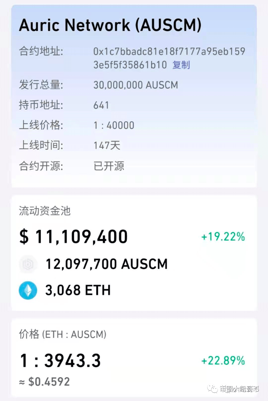 目前,AUSCM 在Uniswap的资金池大小如下图,有3068个ETH,流动资金池1110多万。