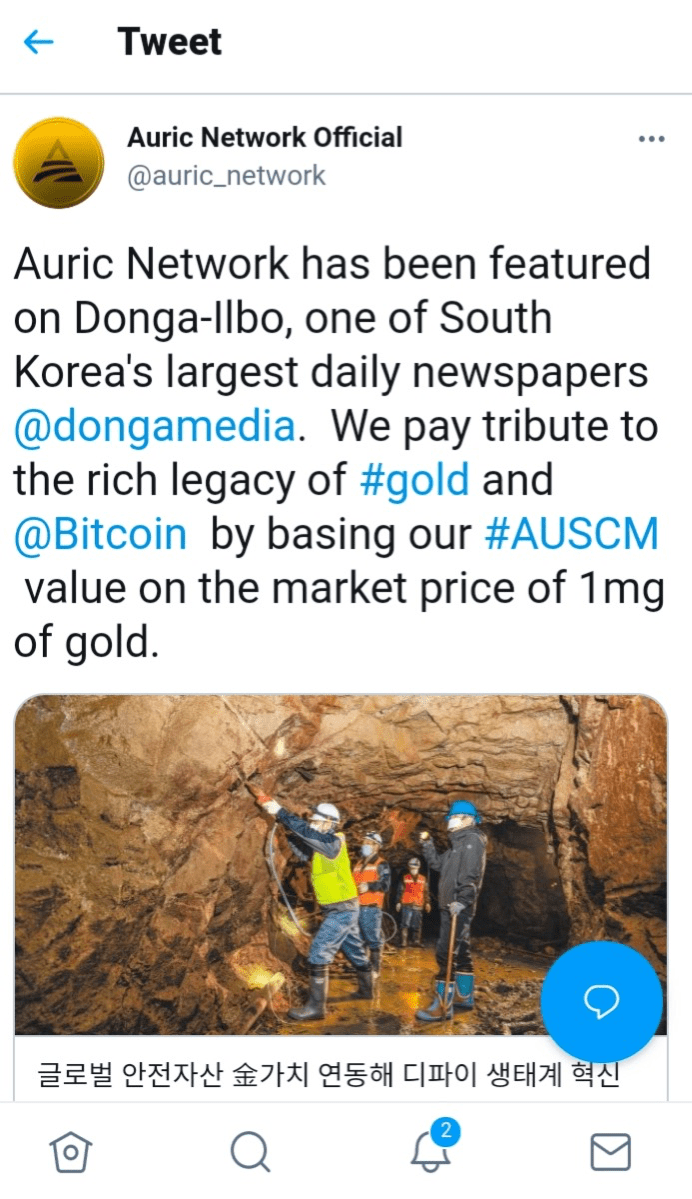 4月13日团队光荣的公布了令人可喜的数据:AURIC Network代币AUSCM市值排名已冲进前三,并列成为全球最大的合成代币;同时,在韩国最大的日报之一《东阿日报》(Donga-Ilbo)上,刊登了AURIC Network名为《黄金网》的专题报道,一起向黄金致敬。