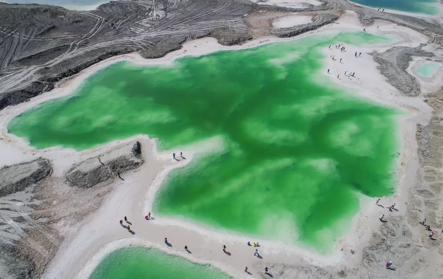 有别于茶卡的是,它并非一整块湖泊,而是由零散分布的小湖泊组成。俯瞰它的时候,呈现在你眼前的一颗颗碧绿的“翡翠”。
