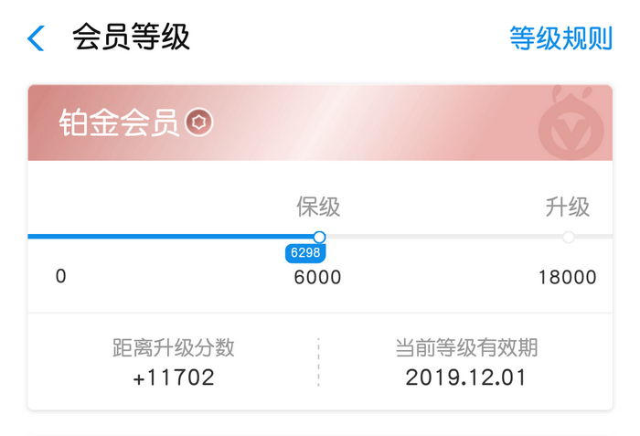 除了大众会员之外,每个等级都有一定的升级门槛,且与你的消费是挂钩的,消费越多等级越高。其中黄金会员的升级门槛是2000积分,铂金会员的升级门槛是6000积分,钻石会员的升级门槛是1000积分。